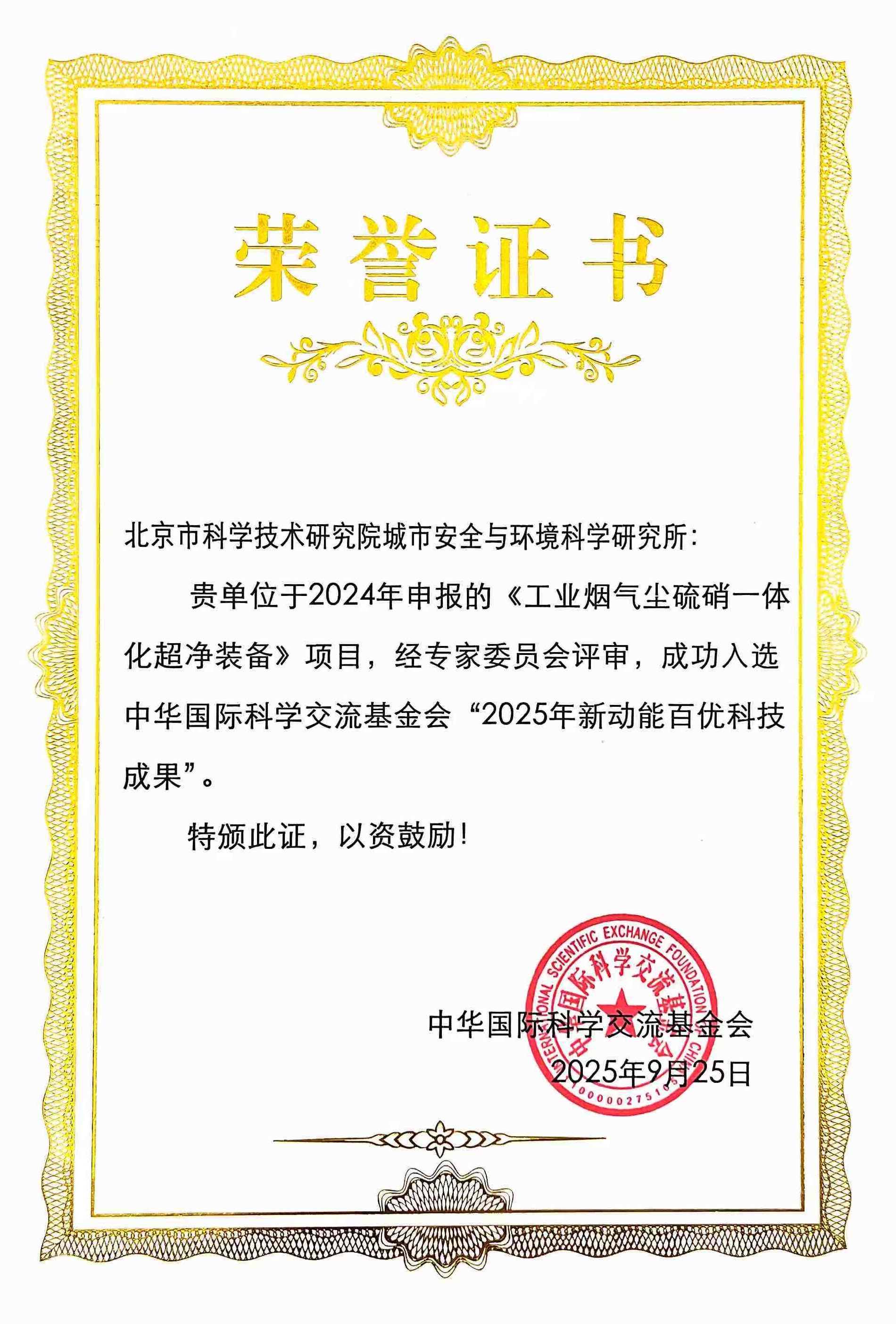 9月25日,中华国际科学交流基金会主办的“2025年新动能百优科技成果发布大会”,城市安全与环境科学研究所(以下简称“城安所”)梁全明牵头申报的《工业烟气尘硫硝一体化超净装备》项目,成功入选“2025年新动能百优科技成果”。