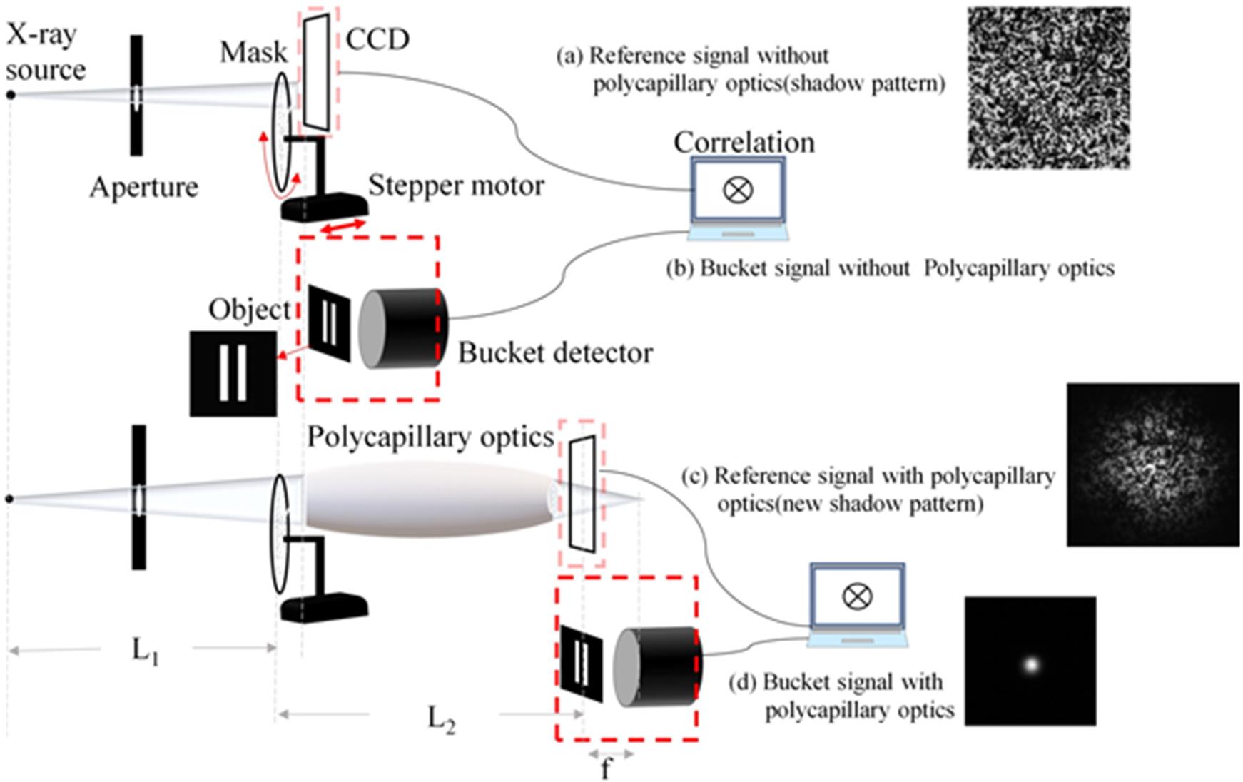 图2.无透镜方案与会聚透镜掩膜强度调制的X射线鬼成像方案示意图