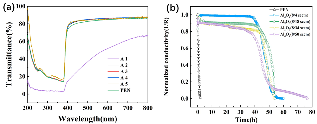 图2.(a)不同O₂气流量下制备的Al₂O₃薄膜的透光度,(b)不同O₂气流量下制备的Al₂O₃薄膜以及PEN薄膜封装下的Mg膜电导衰退曲线