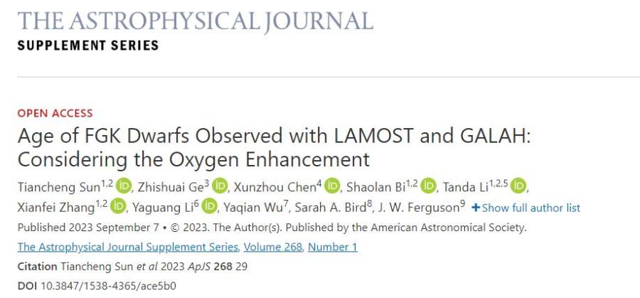 近日,北京天文馆与北京师范大学天文系恒星物理团组联合研究工作取得新进展。恒星的年龄对于研究银河系的形成与演化历史至关重要。在使用恒星模型测定恒星年龄时,模型的金属元素混合模式,即恒星内部每种金属元素的相对比例,会影响恒星的不透明度,改变恒星内部热结构,进而影响恒星的演化时长。一般来说,恒星模型中使用的金属元素混合模式是太阳的金属元素混合模式,另一种普遍存在的模式为α增丰模式,即α元素(氧、氖、镁、硅、硫、钙、钛)同等程度地高于太阳。然而,近年来的大规模巡天观测,如GALAH、LAMOST,都显示出O元素的增丰程度和其它α元素有明显不同。在模型测试中也发现,单独考虑氧元素的增丰,会显著改变年龄的测定结果。因此,为获得更可靠的恒星年龄,我们需要区别考虑氧元素丰度和其他α元素丰度,从而更好地刻画恒星的年龄-化学元素丰度关系。