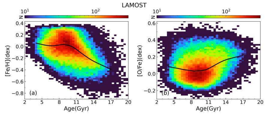 分析这些恒星的化学特征发现,样本星从90亿年前到50亿年前,会出现金属丰度随年龄减小而降低的趋势。在这个时期,这些星的氧丰度会随着年龄减小而逐渐增加,暗示较年轻的星族会更富氧。(图3、图4)