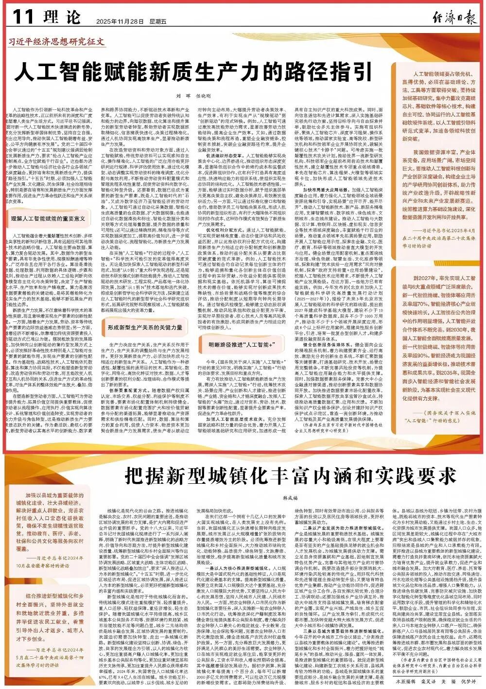 11月28日,北京市习近平新时代中国特色社会主义思想研究中心研究员、北京市科学技术研究院党组书记刘晖;北京市习近平新时代中国特色社会主义思想研究中心研究员、北京市科学技术研究院科技智库中心主任任晓刚于《经济日报》发表理论头条文章,原文刊载于《经济日报》2025年11月28日第10版。