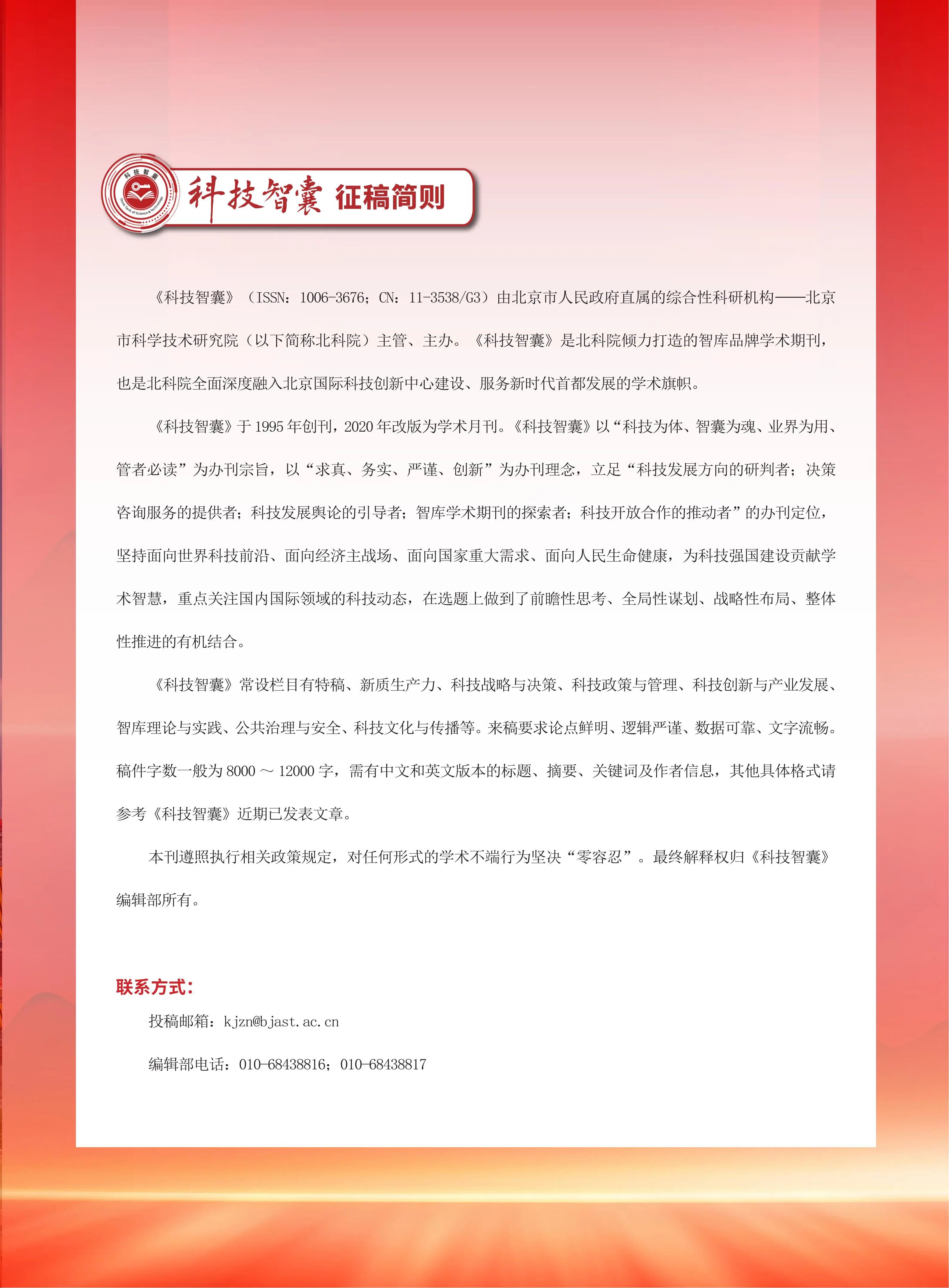 《科技智囊》杂志秉持“智囊为魂,科技为体,业界为用,管者必读”的办刊方针,是北京市科学技术研究院主管、主办的新型高端智库期刊。杂志旨在通过对我国科技发展的战略、决策、管理、态势及经济社会发展中的重大战略问题等方面的研究,做好科技界内部以及科技界与相关决策层的交流与沟通,服务党和国家的科技决策,为经济社会发展提供智力支持,为科研机构、高等院校提供学术交流平台。