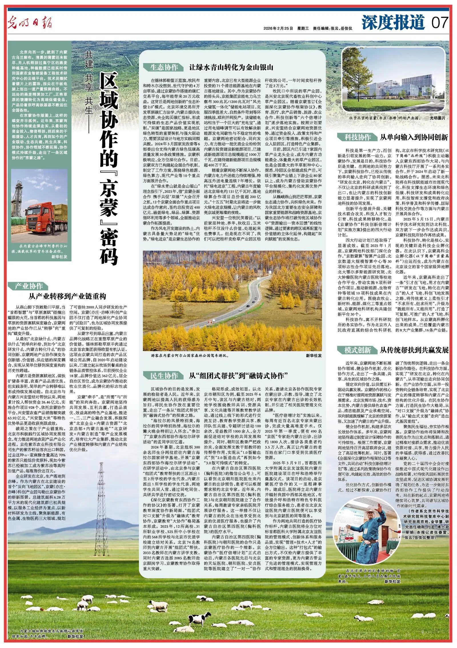 优化协作方式,创新协作模式。经过不断探索,京蒙协作打破了传统帮扶逻辑,走出一条全新协作路径。在科技协作方面,实现了“研发在北京,转化在内蒙古”,从单项输出走向协同创新。在产业协作方面,从单一投资转向全链条培育,实现了北京产业的梯度转移和内蒙古产业结构的优化升级。在民生协作方面,打造民生协作大格局,从“对口支援”升级为“融铸式”协作,从“输血式支援”走向“造血式基因重组”。