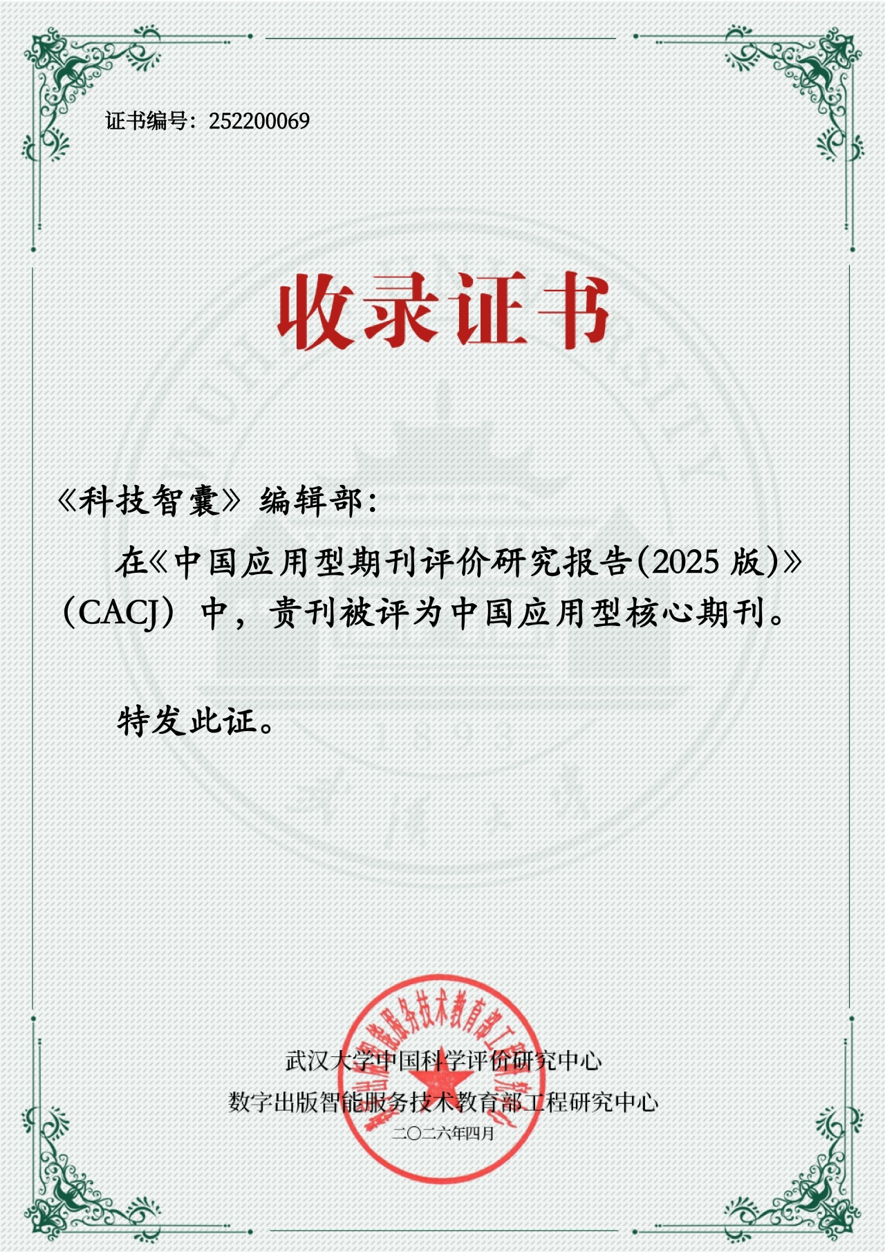 4月10日—12日,“第二届中国应用型期刊高质量发展研讨会暨《中国应用型期刊评价研究报告(2025版)》发布会”在广西南宁举行。至此,备受学界和行业关注的《中国应用型期刊评价研究报告(2025版)》(以下简称《报告》)正式发布。《科技智囊》被评为“中国应用型核心期刊”(CACJ)。杂志副总编辑刘光宇研究员应邀参会并领取证书。《报告》由武汉大学中国科学评价研究中心联合数字出版智能服务技术教育部工程研究中心研制开发,每两年发布一次。本次《报告》对我国3872种应用型期刊进行评价,覆盖17个行业大类和3个综合大类,系统遴选出341种应用型核心期刊。《科技智囊》凭借内容生产、知识传播、社会服务、声誉表现和价值应用等多维度的综合实力,一举跨越“入库”和“扩展”等阶段,直接跻身“核心”,充分彰显了其作为应用型期刊的领先地位与核心竞争力。