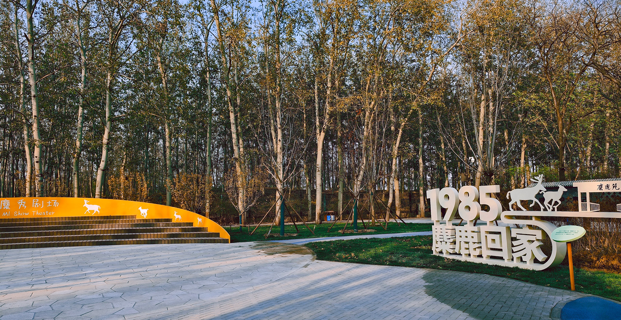 步入园区,主雕塑“归途”映入眼帘,麋鹿一家踏浪前行,彰显出麋鹿保护事业勇于创新、积极进取的精神风貌;景墙上的浮雕再现四十年来麋鹿保护的光辉历程和重大事件;体验式的科普设施为广大公众学习麋鹿保护知识提供了新的方式;沉浸式的剧场,为开展科普活动,讲好麋鹿故事搭建了全新的平台。