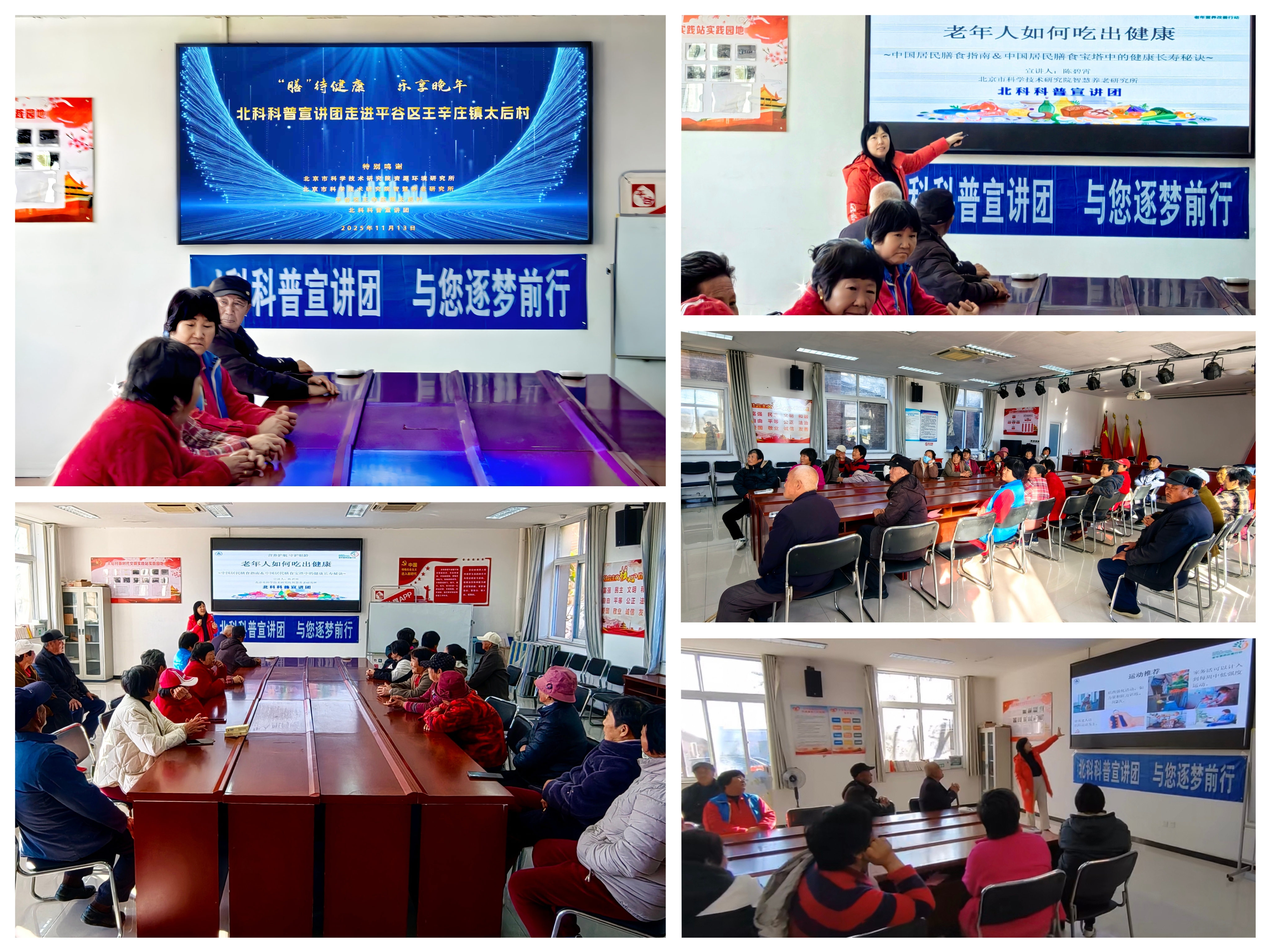 11 月 13 日,北科科普宣讲团走进平谷区太后村,来自北京市科学技术研究院智慧养老研究所营养学博士、宣讲团杰出讲师陈碧霄,以“‘膳’待健康,乐享晚年”为主题带来老年人如何吃出健康”科普宣讲,将实用营养知识送到村民家门口。