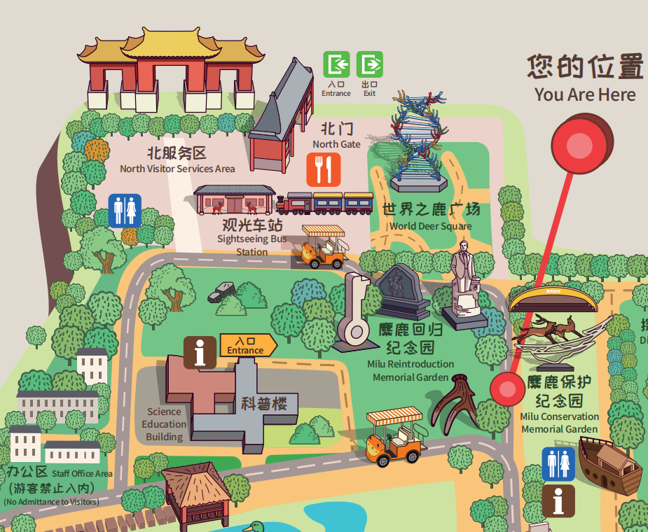 新版导览图采用精心设计的手绘风格,将麋鹿苑内各功能区域、标志性建筑、科普设施区域及自然生态景观生动勾勒于图中。与传统平面导览相比,手绘图不仅画面活泼亲切,更直观展现出苑区的布局结构与景观特色,方便游客快速了解全苑概况,规划游览动线。