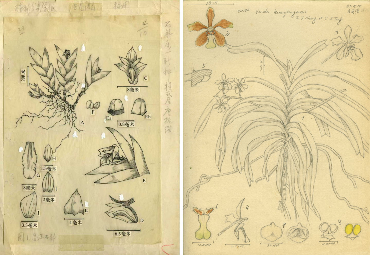 左图:昌江石斛(唐振緇绘制);右图:广东万代兰(程式君绘制)