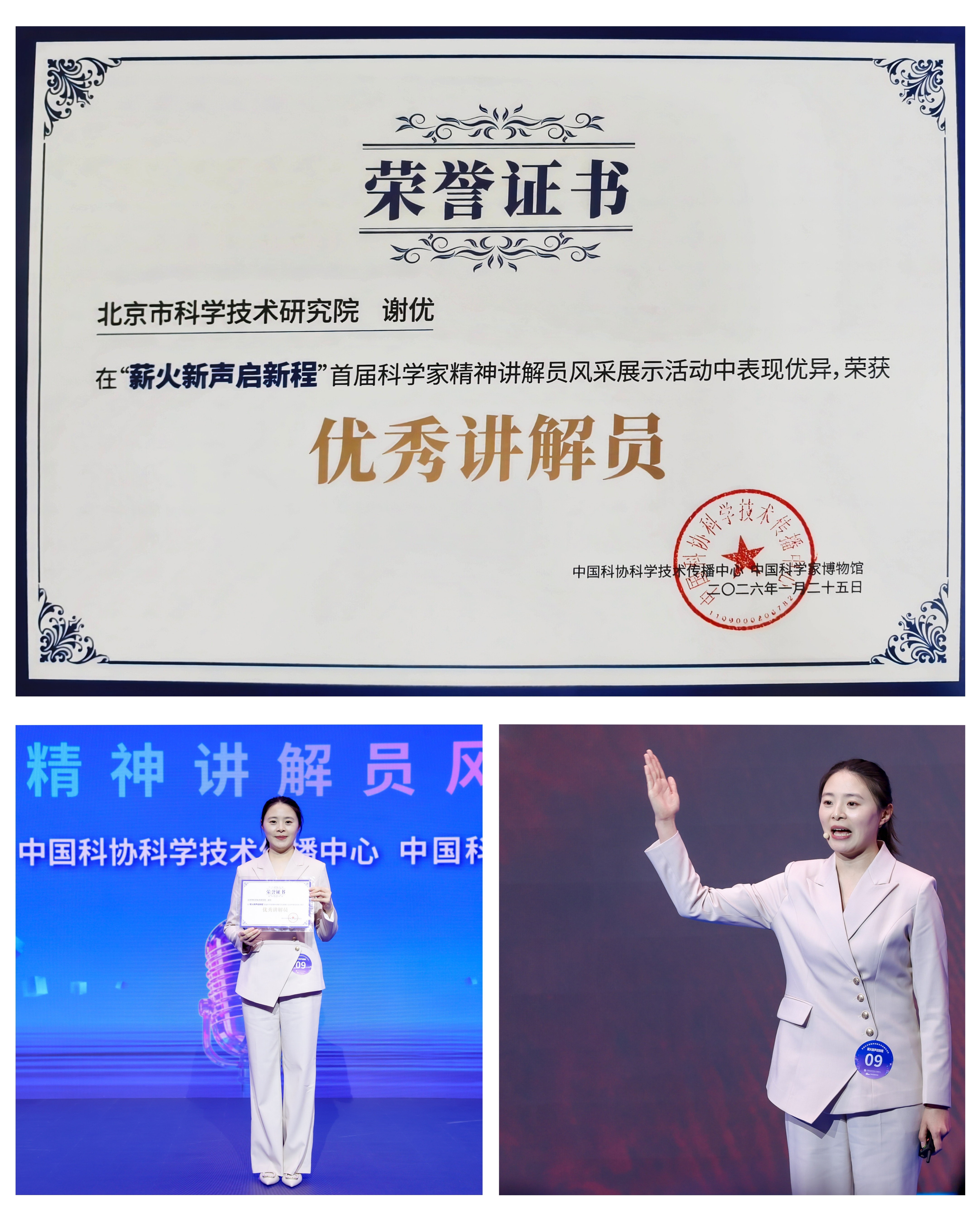 1月25日,由中国科协科学技术传播中心、中国科学家博物馆主办的“薪火新生启新程”首届科学家精神讲解员风采展示活动在国家科技传播中心圆满落幕。北京天文馆科技辅导员、北科科普宣讲团杰出讲师谢优,代表北京市科学技术研究院,从全国190位选手中突围,荣获“优秀讲解员”称号。人民日报客户端等6家平台同步直播,总观看量超800万人次。