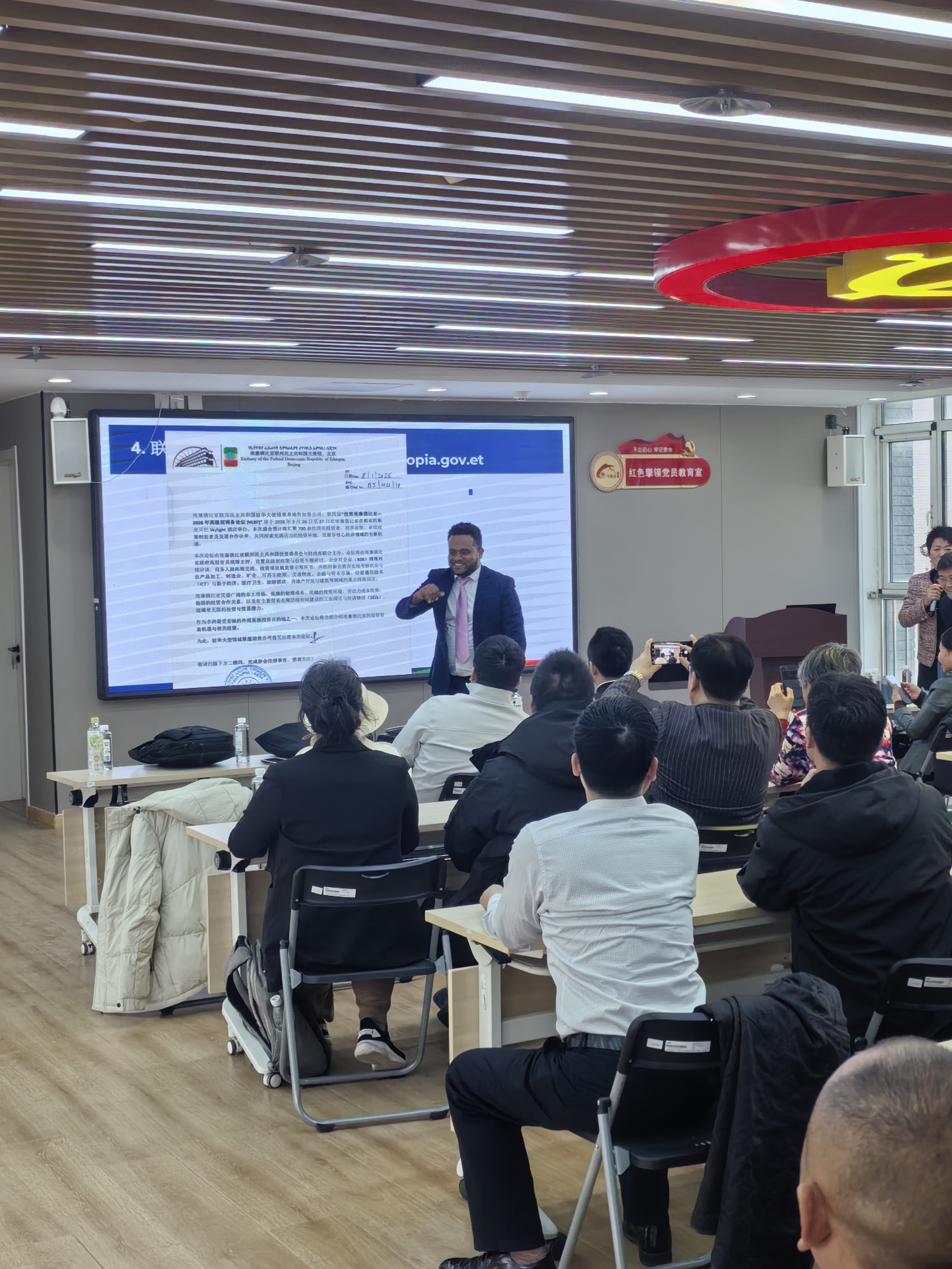 3月19日,由中经联现代服务业工作委员会、埃塞俄比亚驻华大使馆主办,三创合一(北京)科技有限公司承办,北京北科控股有限公司、马连洼街道专属孵化器协办的“一带一路”宣讲会在马连洼街道专属孵化器路演厅举办。本次活动围绕内外双循环、政校企协同、丝路华章大使领创计划为主题的中埃塞交流研讨会,旨在能进一步凝聚共识、深化合作,以政校企协同夯实内循环根基,以产教出海拓展外循环格局,共同书写中非友好、互利共赢的新篇章。活动累计吸引来自政府部门、高校院所、优秀企业、社会组织等40余名代表到场参会。
