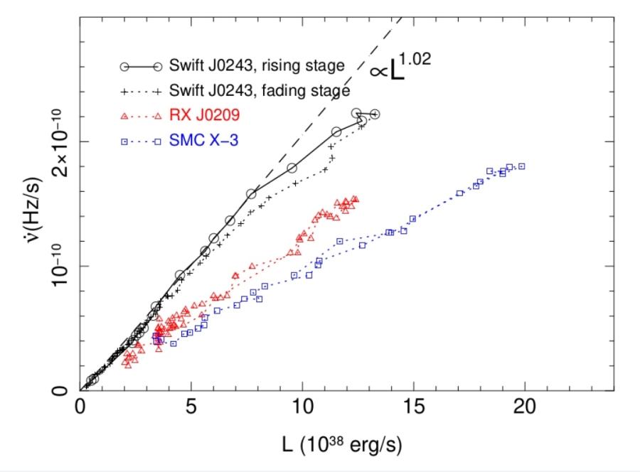 让人奇怪的是,尽管Swift J0243的磁场在这三个源中最小,研究人员发现它的自旋的加速率却最快!理论上来说,磁场越大,中子星的磁球半径越大,相应的自旋加速应该更快。观测的结果与理论相反!研究人员认为这有两种可能。一种是吸积柱辐射限制的磁场是中子星表面的磁场,而自旋加速限制的是中子星磁球处的磁场(磁球尺度约为百倍的中子星尺度),这两个值不一定一样。磁球处的磁场反应了磁场的偶极分量,而中子星表面的磁场可能是多极成分主导。另一种情况是更强的磁场可能施加了一个更大的自旋减速力矩。实际情形尚待研究。