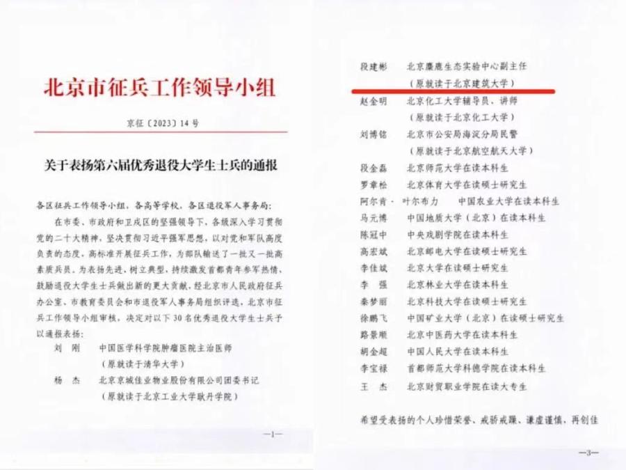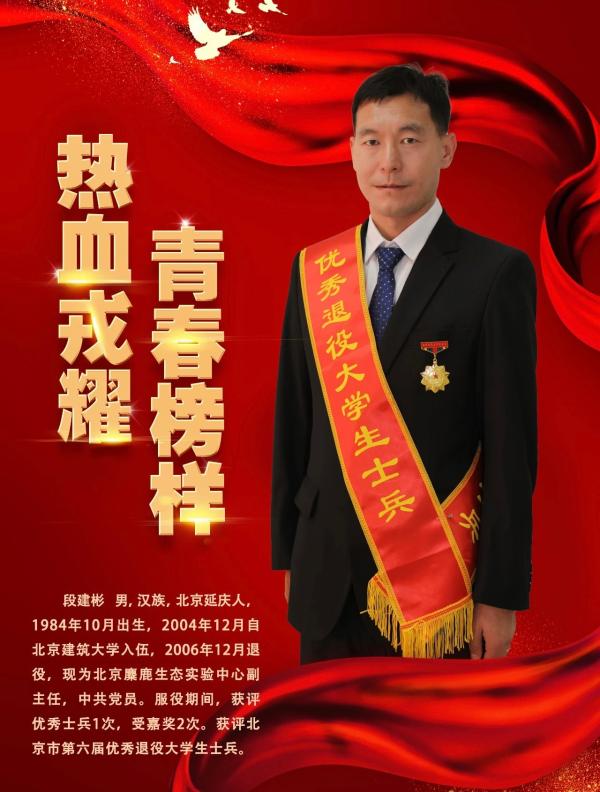 2023年是全面贯彻落实党的二十大精神的开局之年,为深入学习习近平强军思想,突出展现“学校立德树人、部队全面培塑、社会直接受益”的首都人才培养新模式,自2018年以来,北京市连续6年开展优秀退役大学生士兵评选活动。本次评选活动自2022年12月启动以来,经退役大学生士兵报名和各单位推荐,从近2万名符合条件的人员中,筛选出品学兼优、服役期间和工作表现优秀的72人进行激烈的面试答辩,全面衡量退役大学生士兵在“学位”“战位”“工位”上的综合表现。为表扬先进,树立典型,经北京市人民政府征兵办公室、北京市教育委员会和北京市退役军人事务局组织评选,北京市征兵工作领导小组审核,最终共有30名青年荣获“北京市第六届优秀退役大学生士兵”称号。北京麋鹿生态实验中心段建彬同志在此次评选过程中脱颖而出,最终获此殊荣。